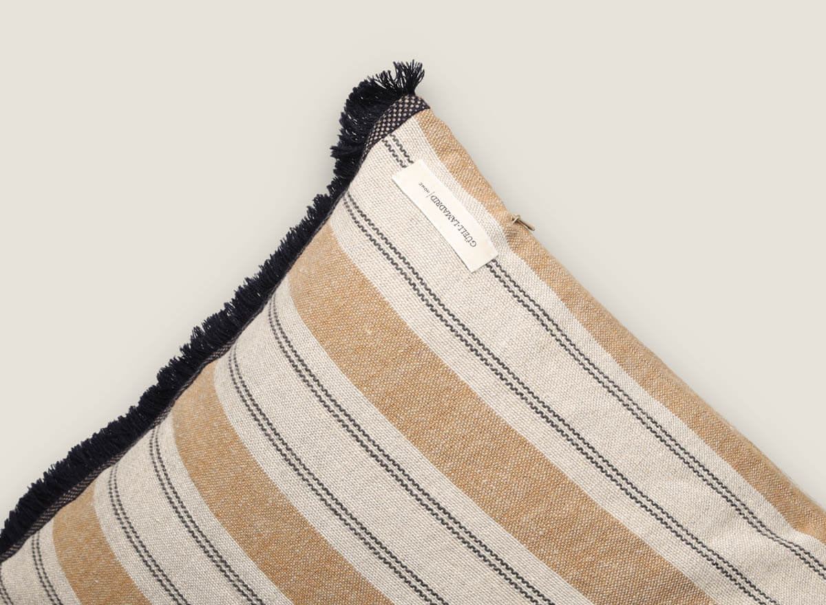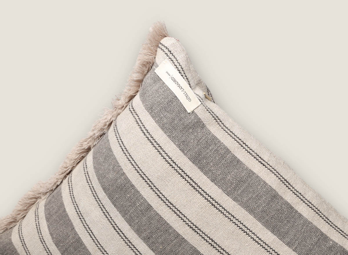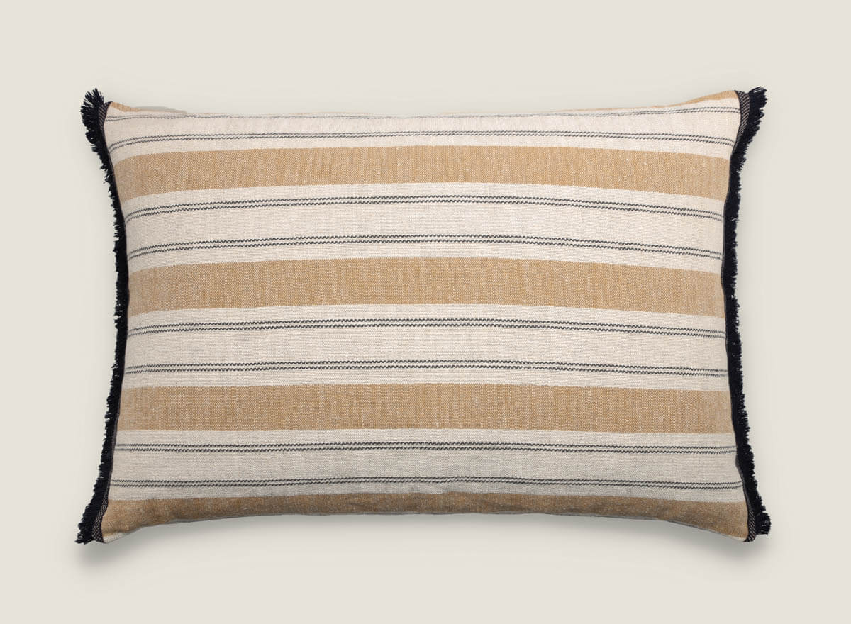 Cojín de lino natural con rayas es la elección perfecta para quienes buscan decorar con estilo y confort. Su diseño presenta rayas horizontales en tonos neutros y cálidos que aportan frescura y armonía a cualquier ambiente, desde el salón hasta el dormitorio. Los laterales se rematan con flecos y pasamanería artesanal en lana, un detalle único que realza su carácter auténtico y artesanal.
