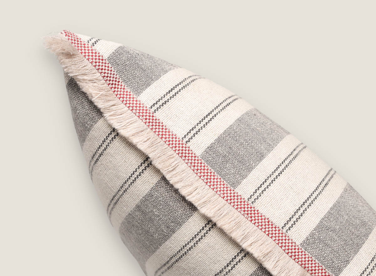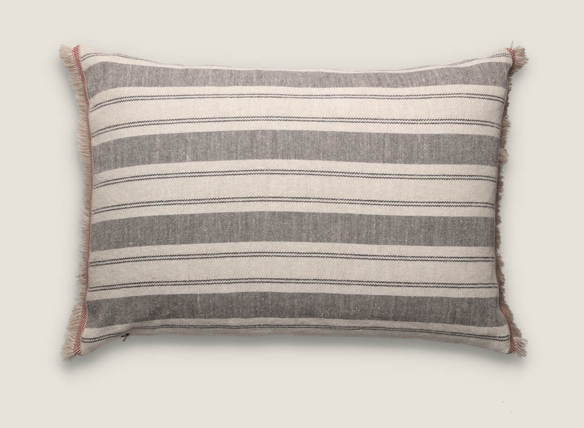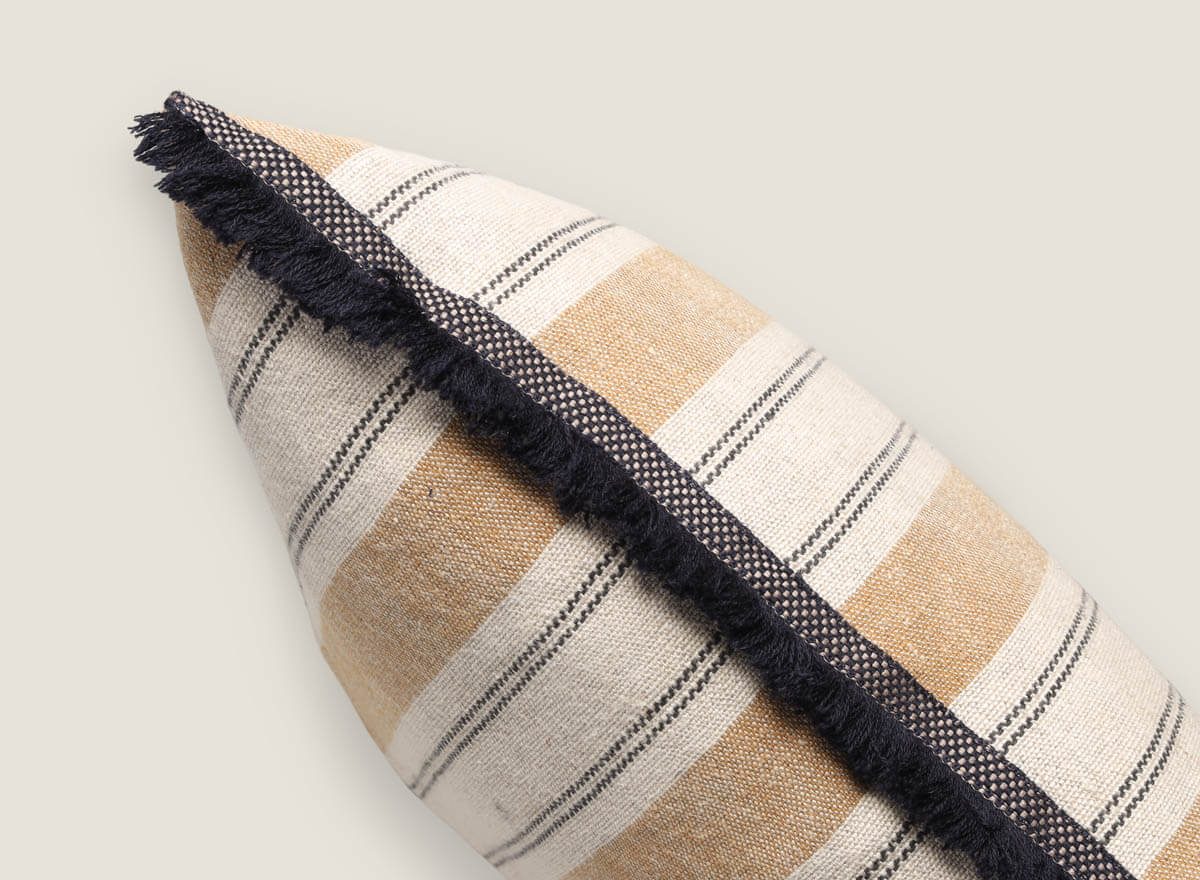 Cojín de lino natural con rayas es la elección perfecta para quienes buscan decorar con estilo y confort. Su diseño presenta rayas horizontales en tonos neutros y cálidos que aportan frescura y armonía a cualquier ambiente, desde el salón hasta el dormitorio. Los laterales se rematan con flecos y pasamanería artesanal en lana, un detalle único que realza su carácter auténtico y artesanal.