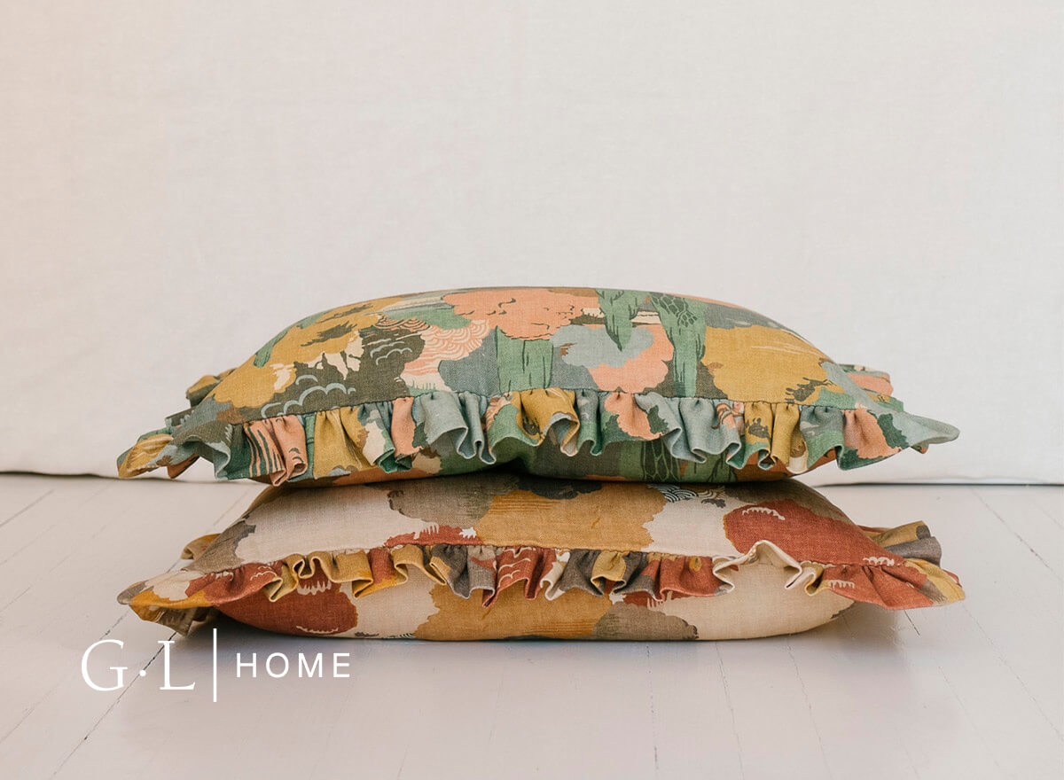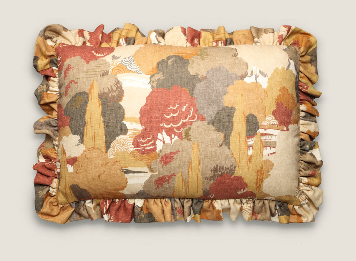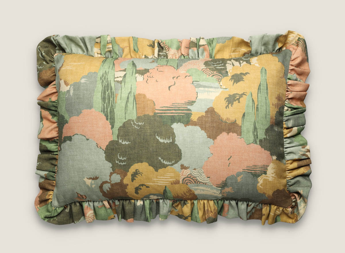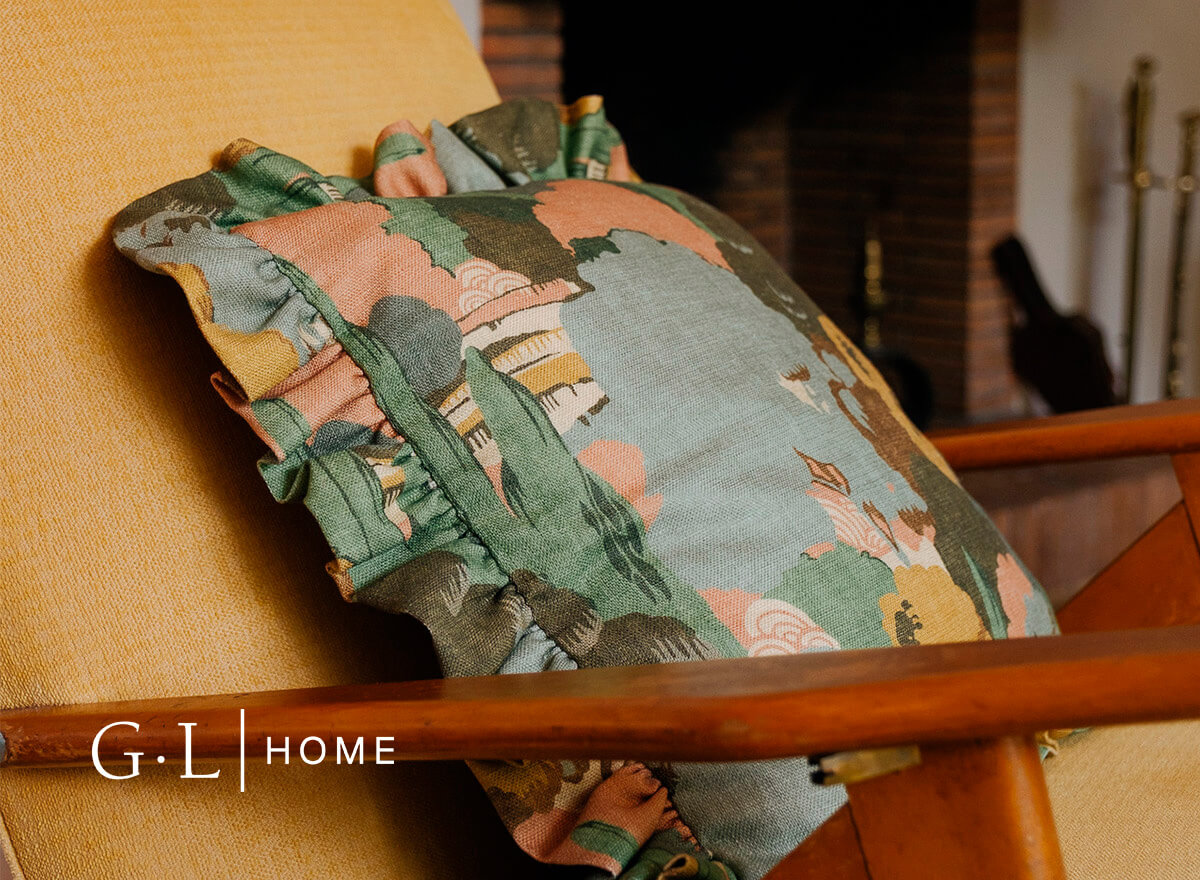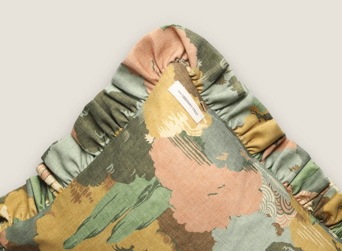 Cojín decorativo con volantes es una pieza única que combina diseño y elegancia con un toque oriental. Su dibujo inspirado en paisajes orientales evoca serenidad y sofisticación, convirtiéndose en un complemento ideal para quienes desean dar personalidad a sofás, butacas o camas.