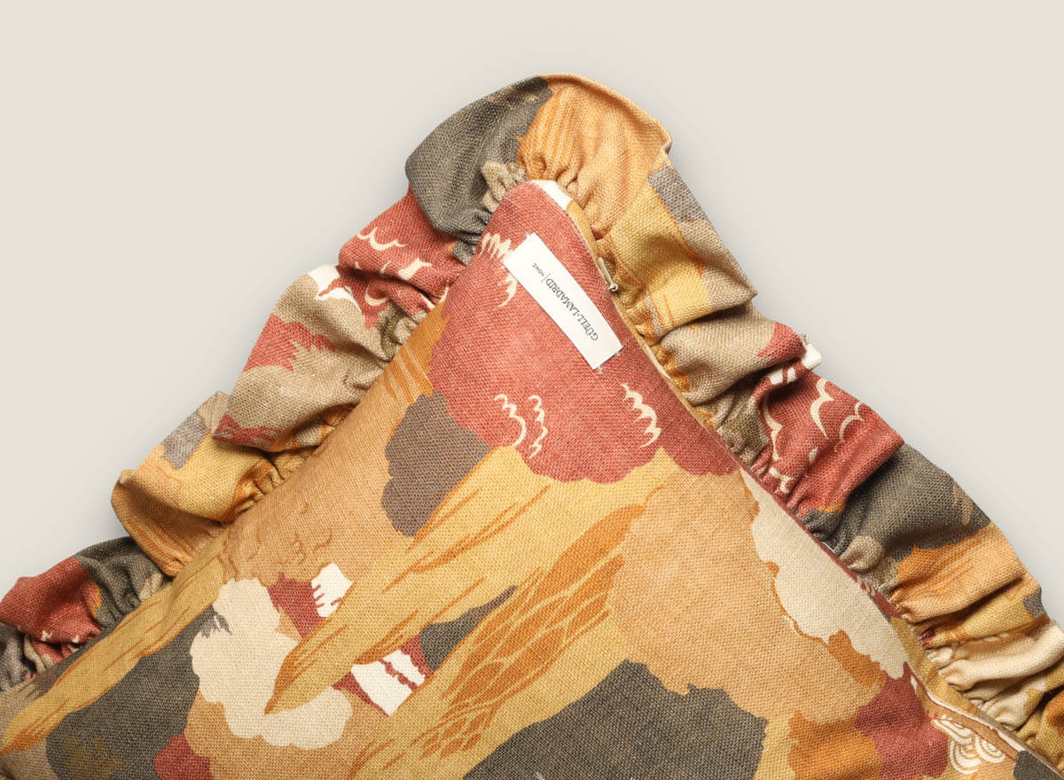 Lo que hace especial a este cojín es su amplio rapport, lo que significa que cada unidad tiene un estampado diferente, garantizando exclusividad en cada pieza. Además, los volantes que enmarcan todo el contorno aportan un movimiento sutil y refinado, convirtiéndolo en una pieza protagonista dentro de cualquier ambiente decorativo.