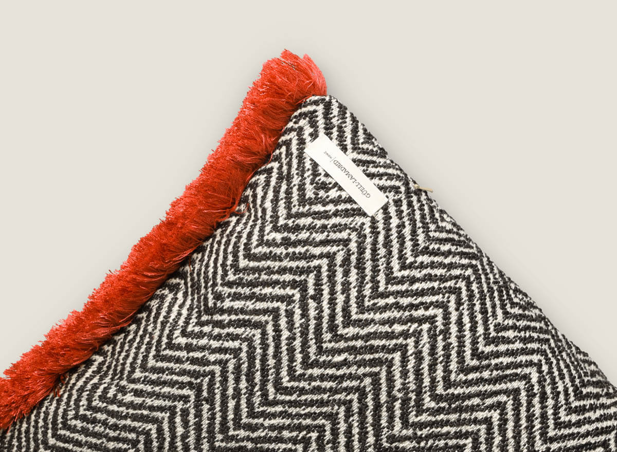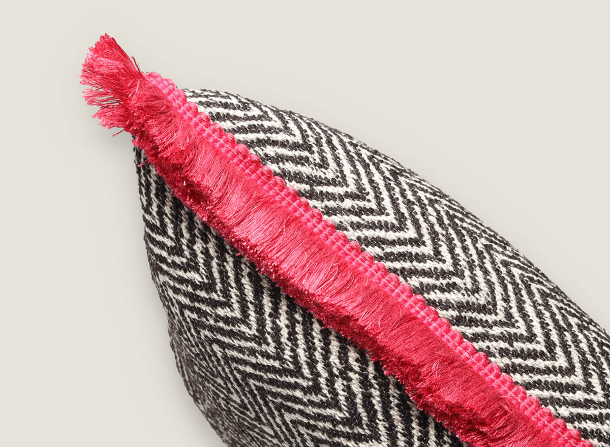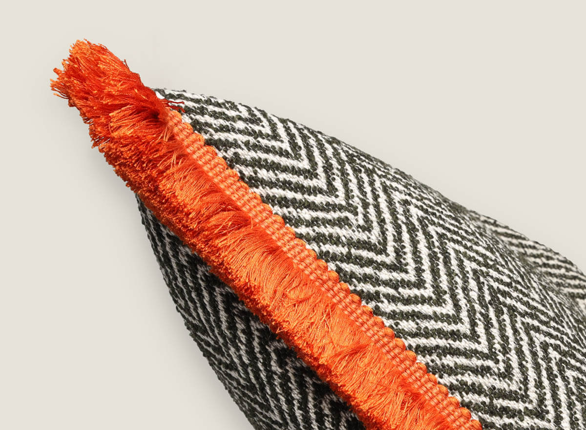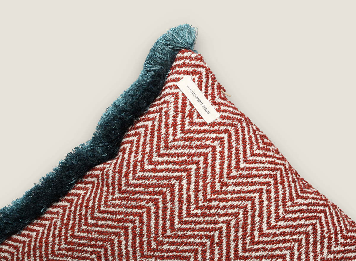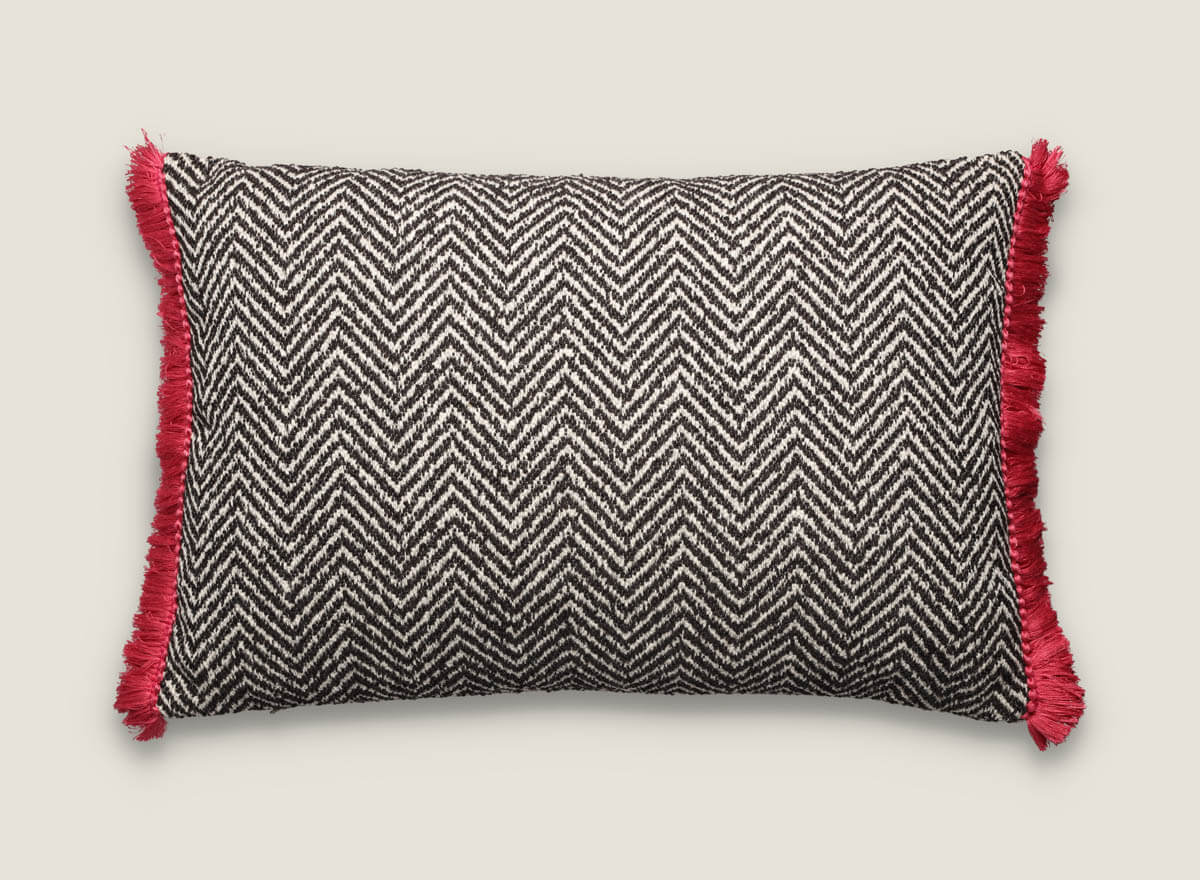 Cojín decorativo combina el clásico dibujo de espiga con una textura densa y elegante, ideal para aportar estilo a cualquier estancia. Sus laterales se realzan con flecos de pasamanería en tonos vibrantes que contrastan con la base, logrando un acabado lleno de personalidad. Disponible en tres opciones de color —espiga negra, verde y roja—, es perfecto para salones, dormitorios o proyectos de interiorismo con carácter.