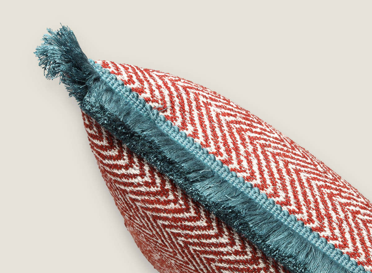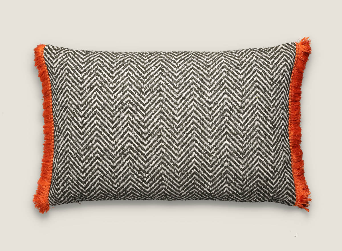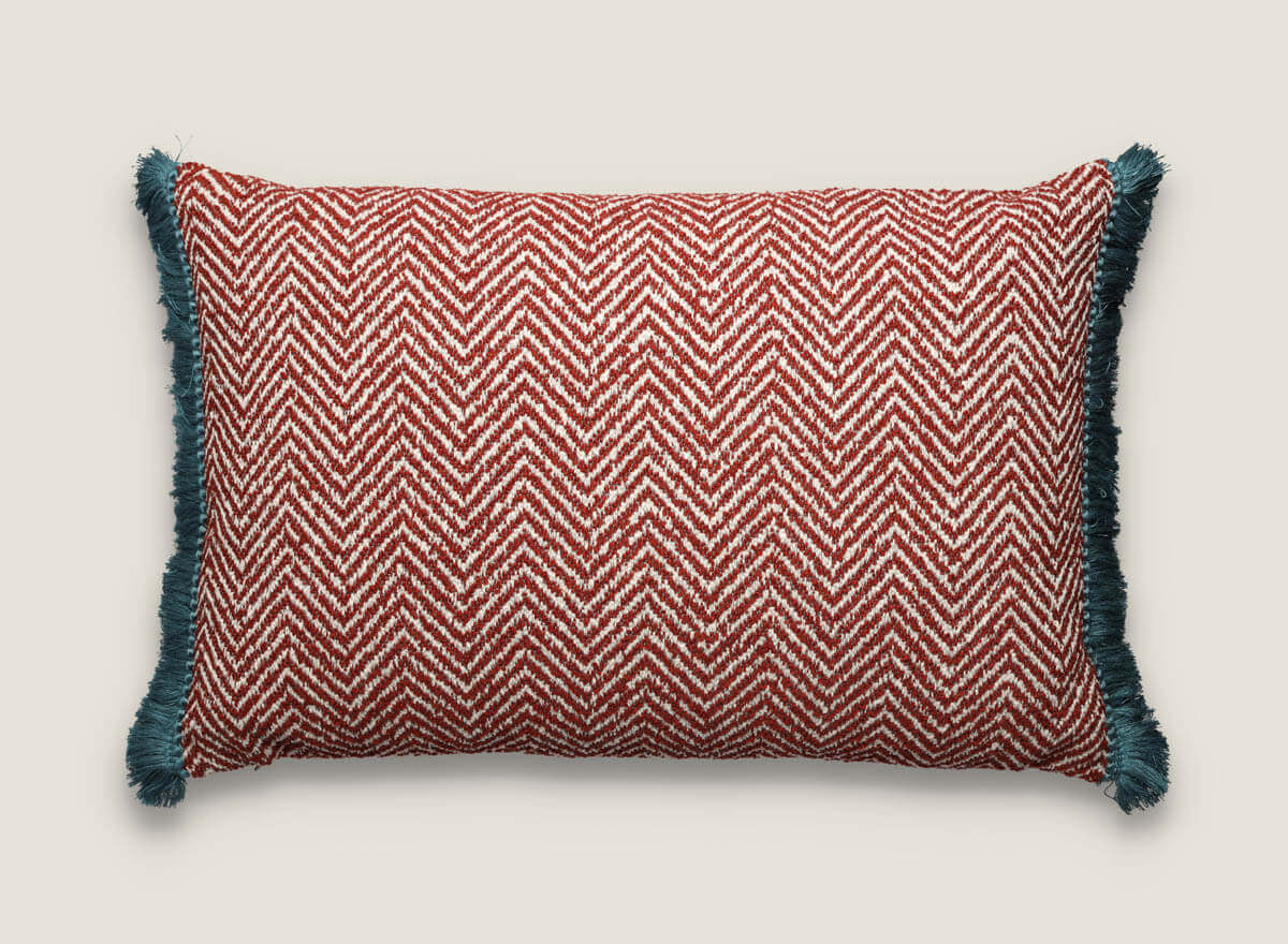 Cojín decorativo diseño de espiga con flecos medida 60×40 cm, una pieza única para quienes buscan elegancia con un toque moderno. Su diseño en dibujo de espiga, de textura densa y atemporal, aporta distinción y equilibrio a cualquier ambiente, mientras que los flecos de pasamanería en colores vivos refuerzan su carácter y añaden un contraste llamativo que lo convierte en un complemento protagonista dentro de la decoración.