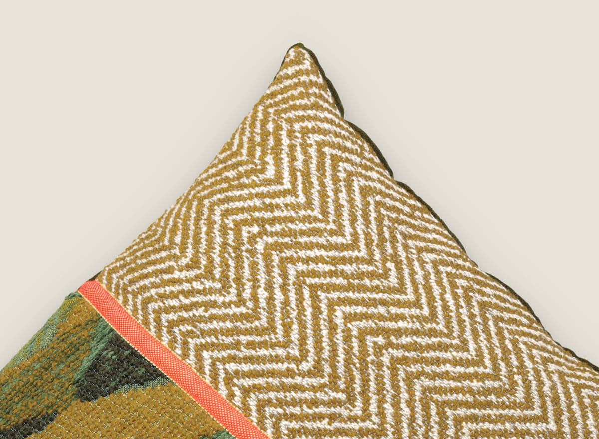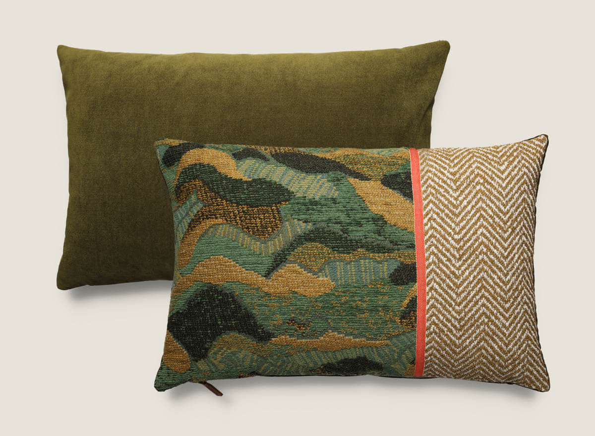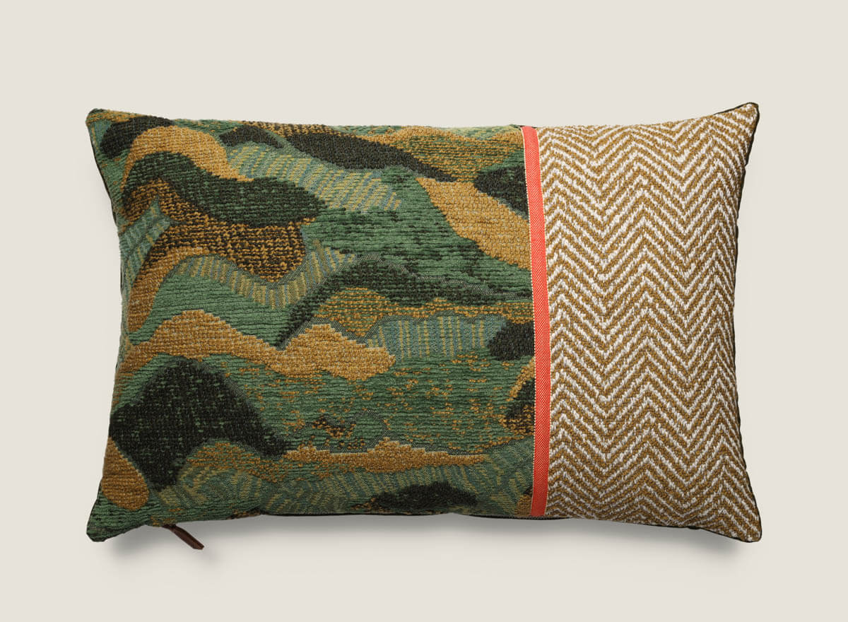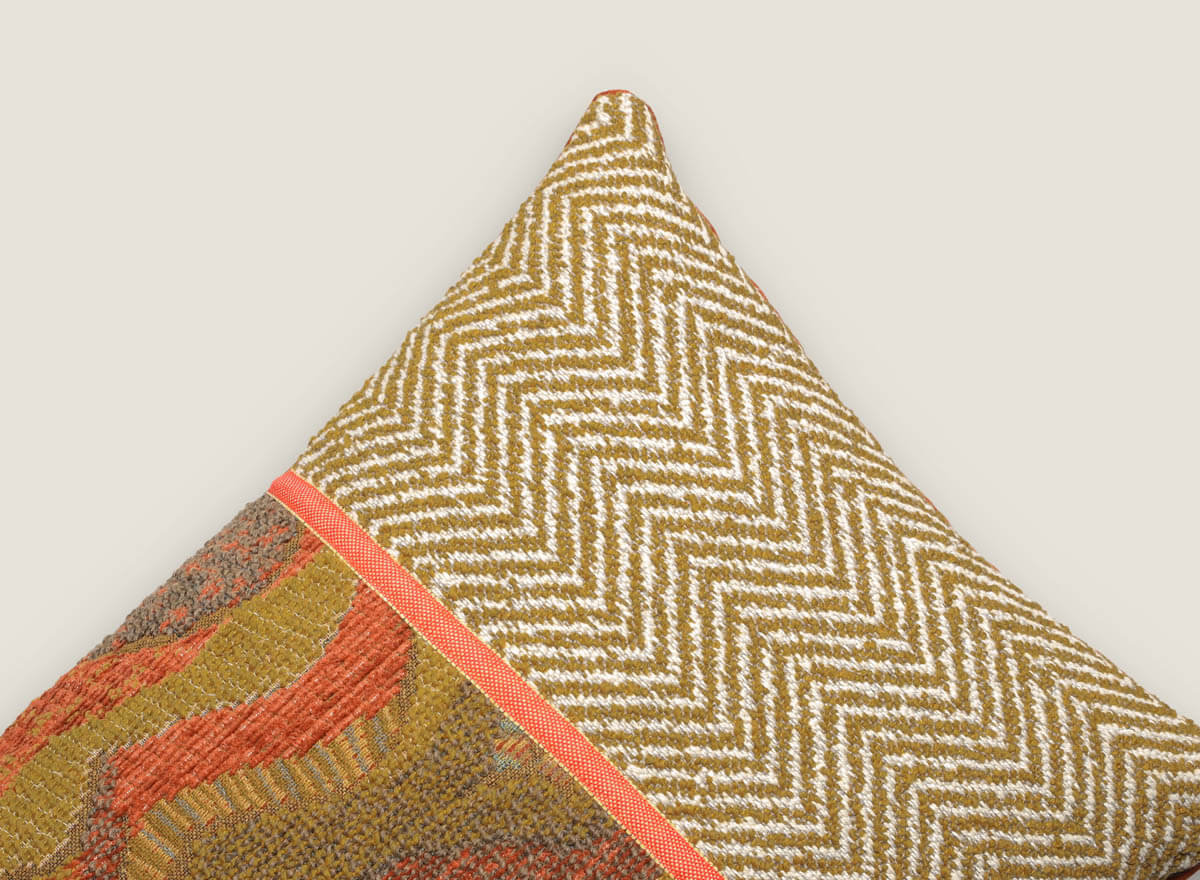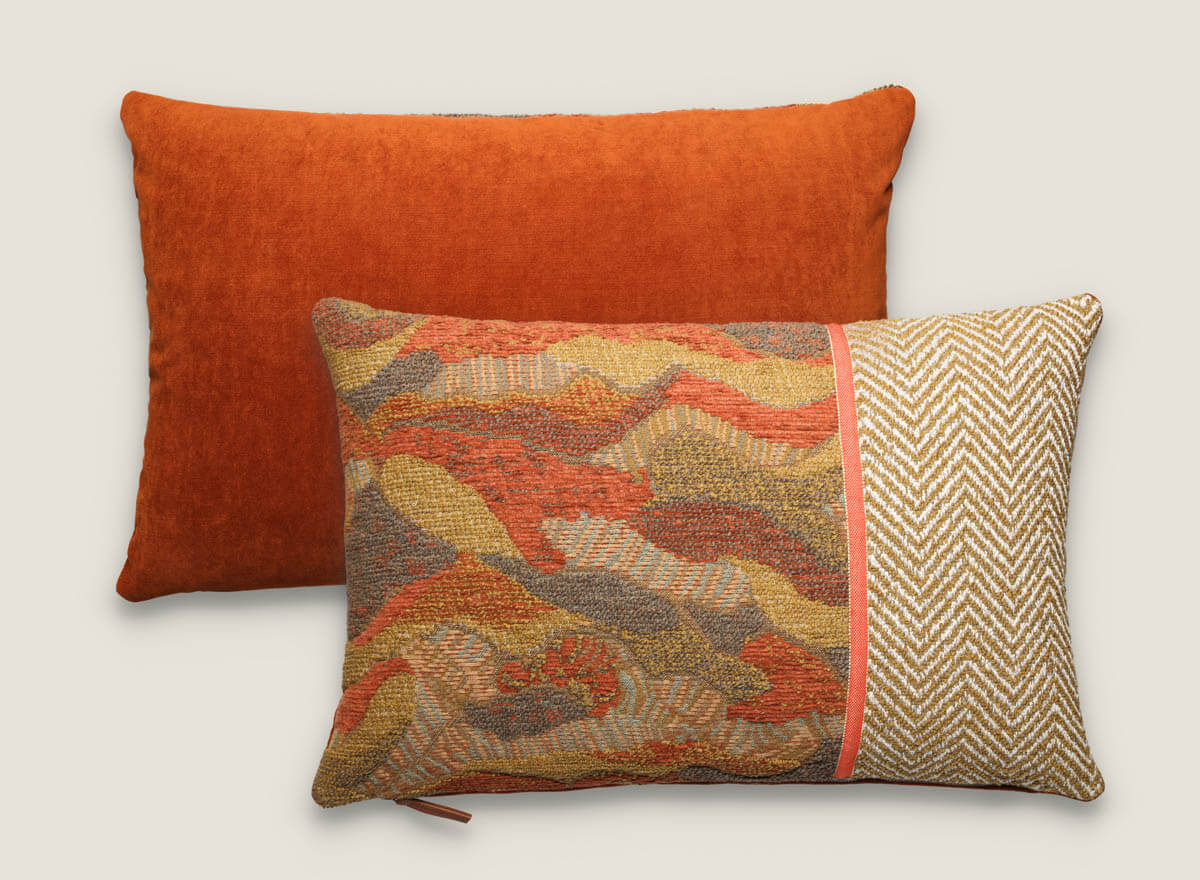 Cojín decorativo 60×40 cm destaca por su originalidad al unir tres tejidos únicos: el dibujo de espiga Trulli, la textura Bend y el terciopelo Palais. Su diseño lleno de carácter lo convierte en la pieza perfecta para añadir estilo a sofás, butacas o camas. Disponible en dos versiones de color, naranja o verde, es ideal para salones modernos y ambientes elegantes.