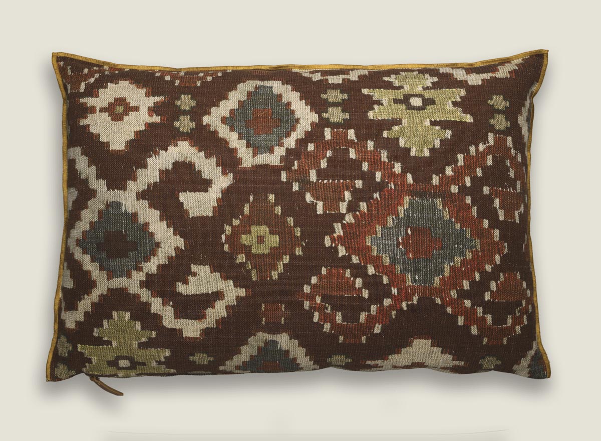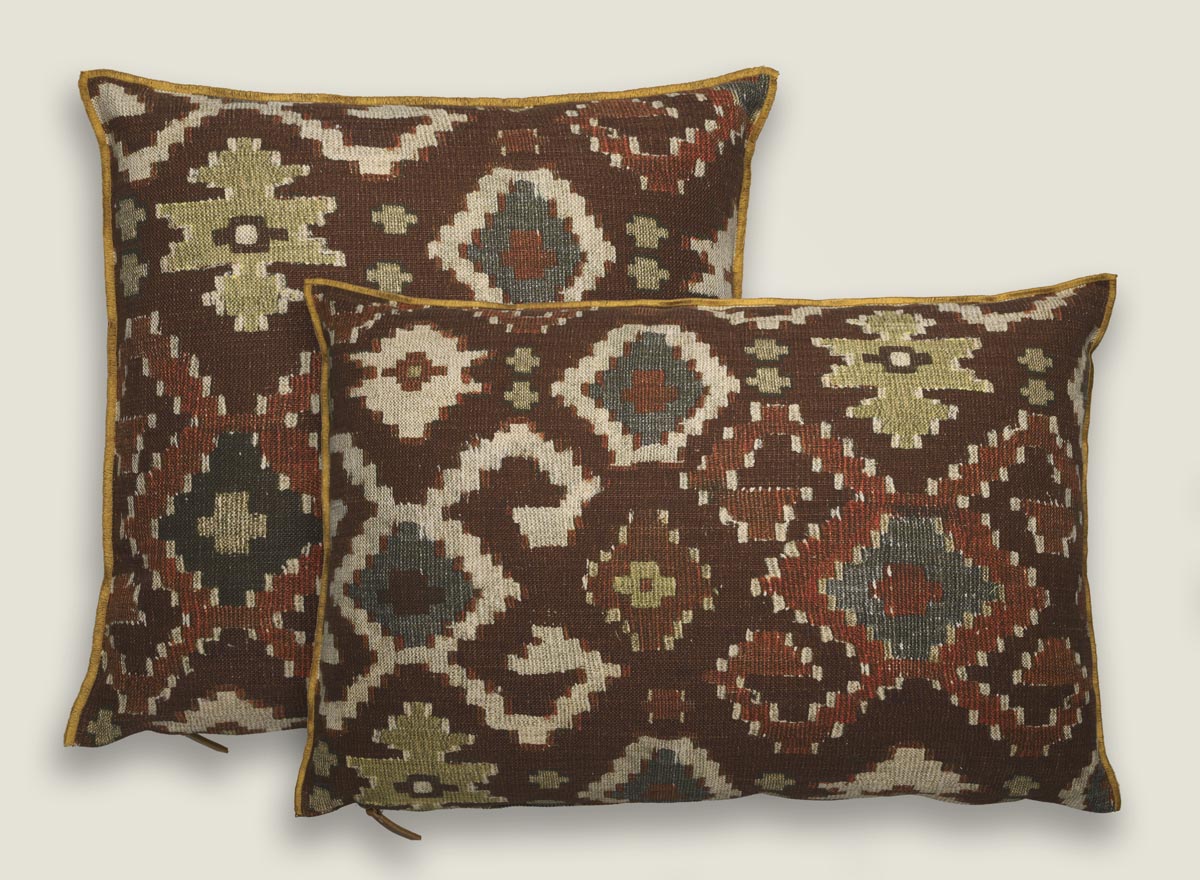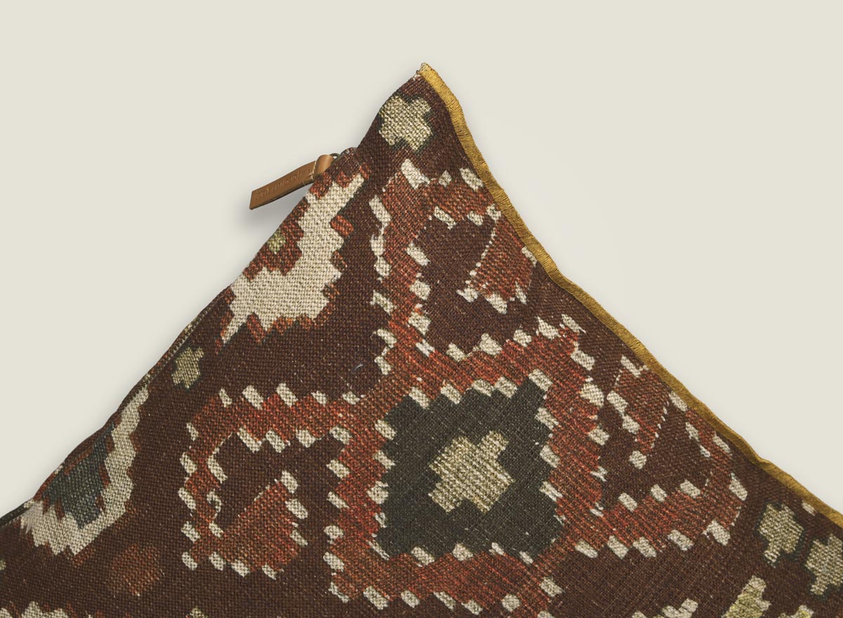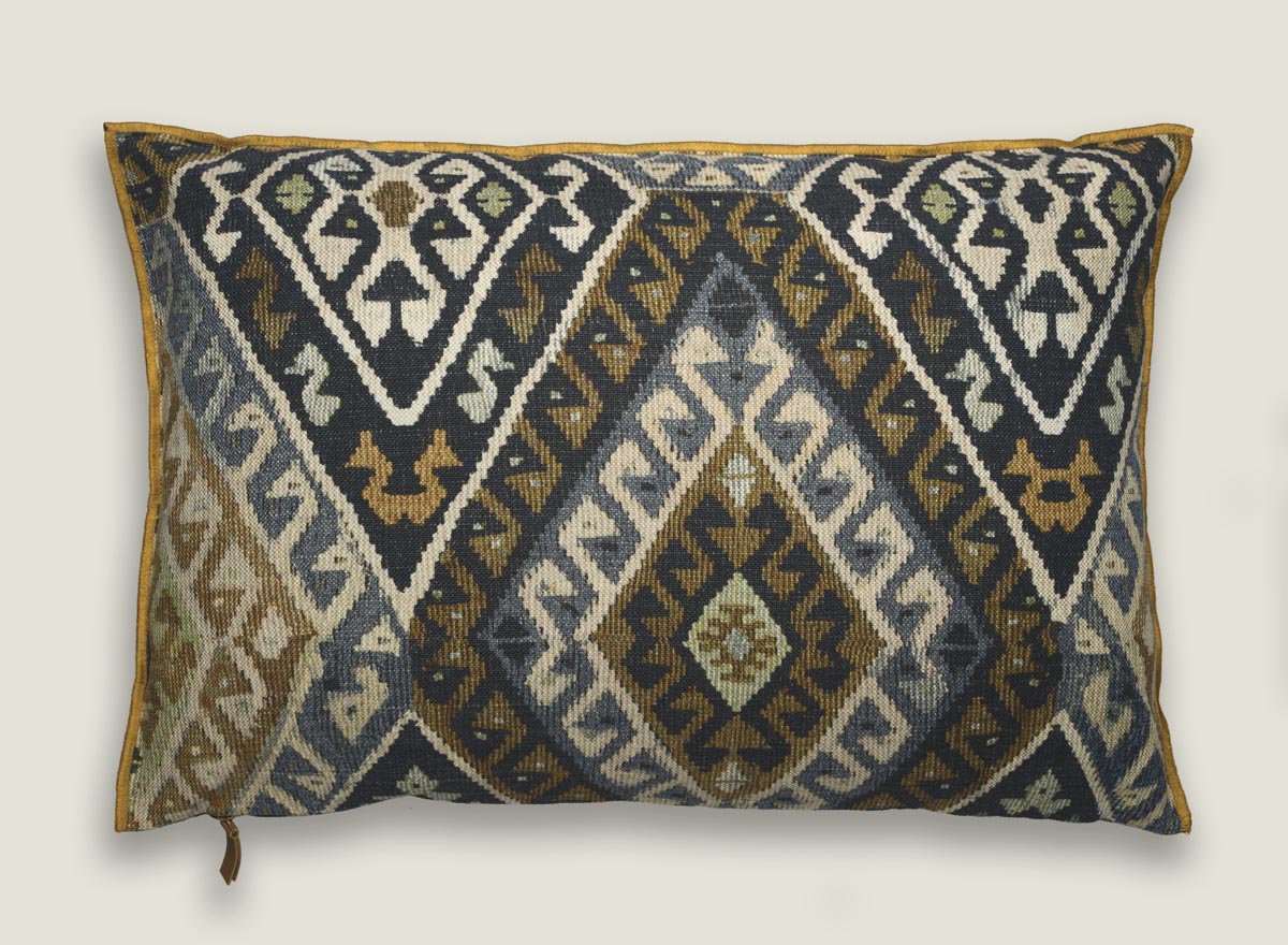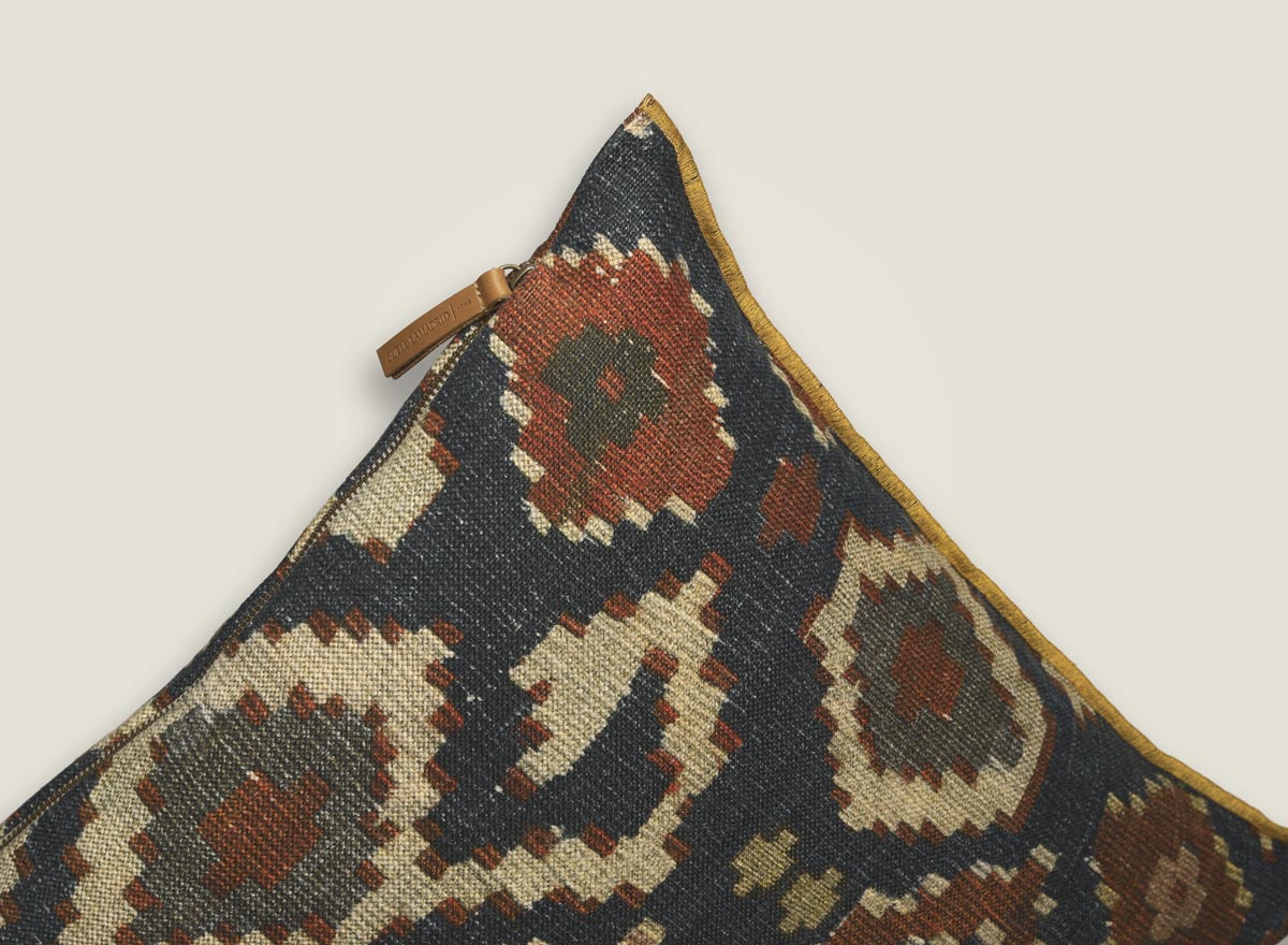 Cojines de inspiración étnica, evocando la rica herencia de los kilims ancestrales. Su diseño geométrico atemporal, realzado por un vibrante acabado overlock en tono mostaza, crea un focal point de estilo bohemio chic.