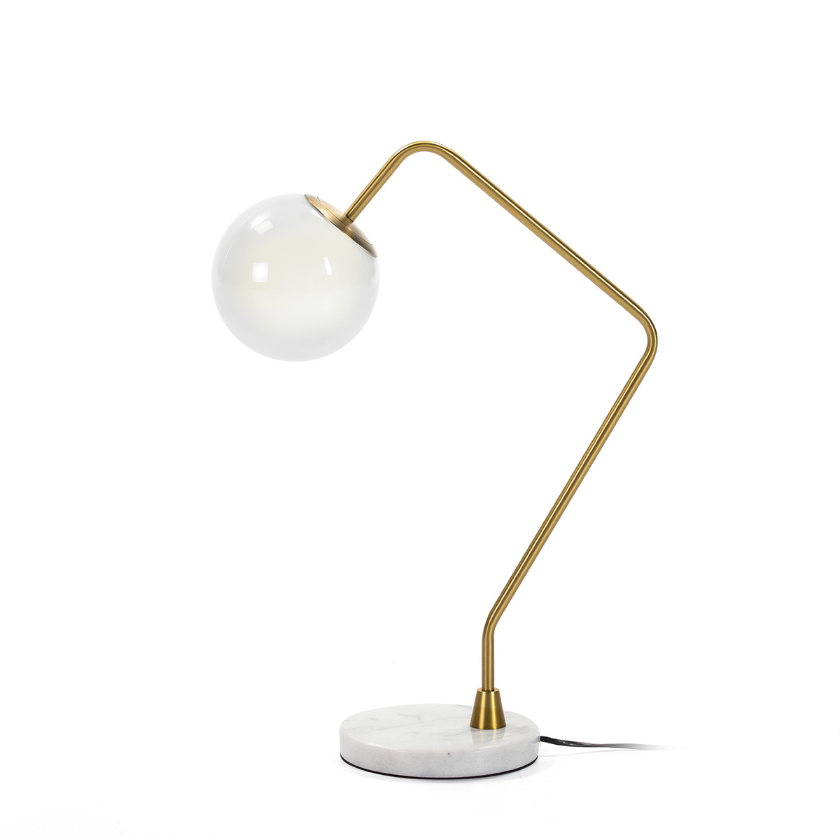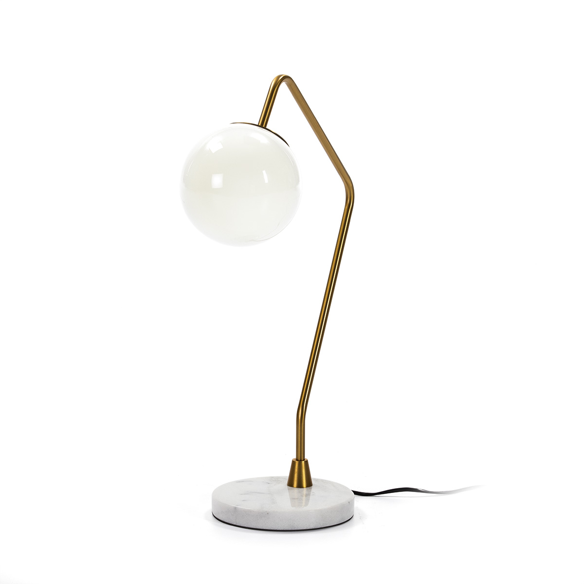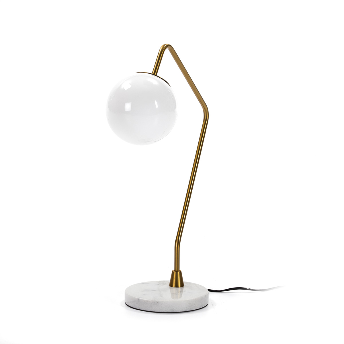 Si buscas una lámpara de sobremesa que aporte personalidad y elegancia, esta pieza es para ti. Con una estructura en metal dorado, tulipa esférica de cristal blanco opalino y sólida base de mármol blanco, esta lámpara combina diseño contemporáneo con materiales atemporales. Su silueta geométrica y su acabado sofisticado hacen que destaque tanto encendida como apagada.