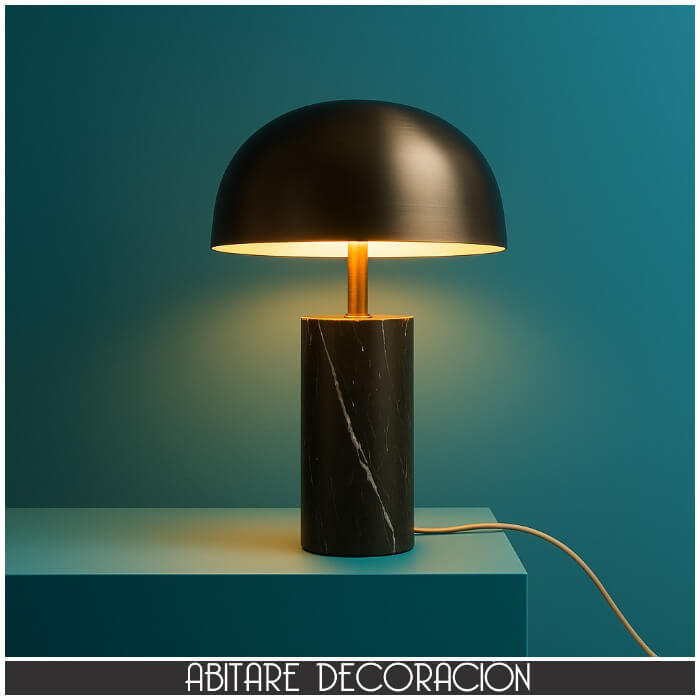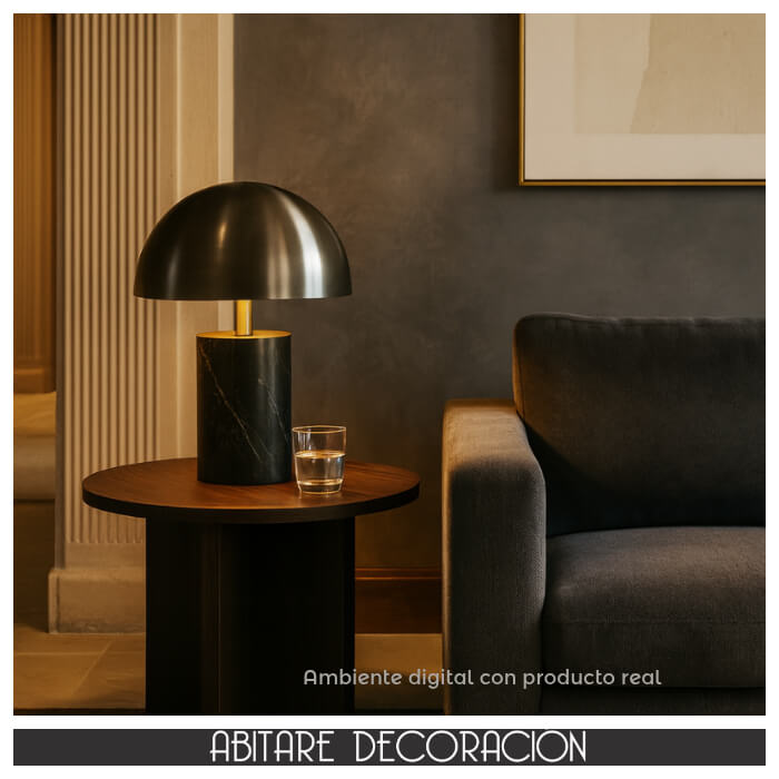 Las lámparas con base de mármol son tendencia por su elegancia atemporal. Esta pieza destaca especialmente en consolas de entrada, mesitas auxiliares, escritorios o mesitas de noche. Su acabado en mármol negro combina con mobiliario en tonos neutros, madera oscura, latón, negro mate y textiles en beige o gris topo. La pantalla metálica proyecta una luz suave y difusa que resulta ideal para crear un ambiente acogedor en un rincón de lectura o como iluminación secundaria en el salón.