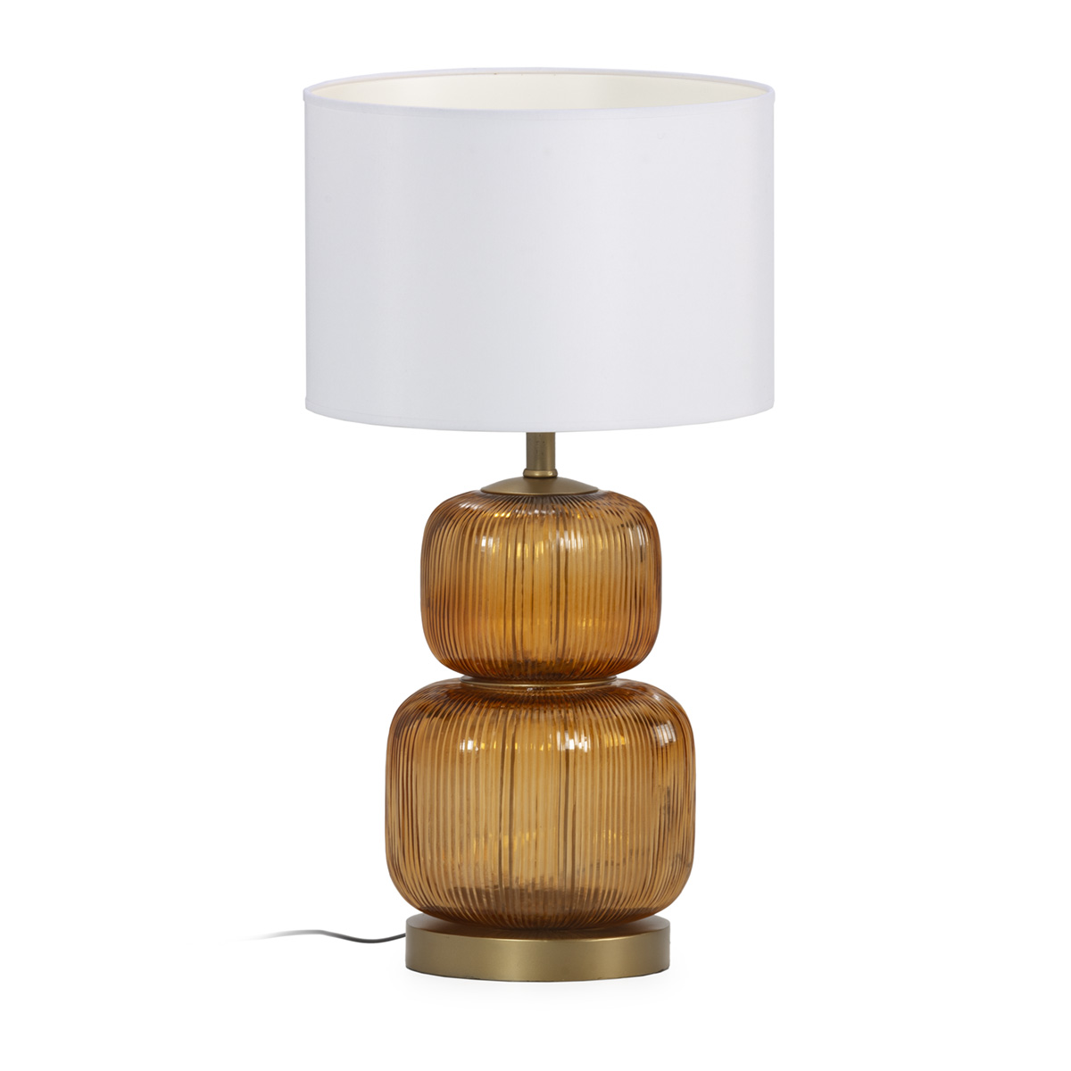 Lámpara de sobremesa de cristal ámbar y metal dorado. Elegante y sofisticada, ideal para salones modernos, dormitorios y escritorios.