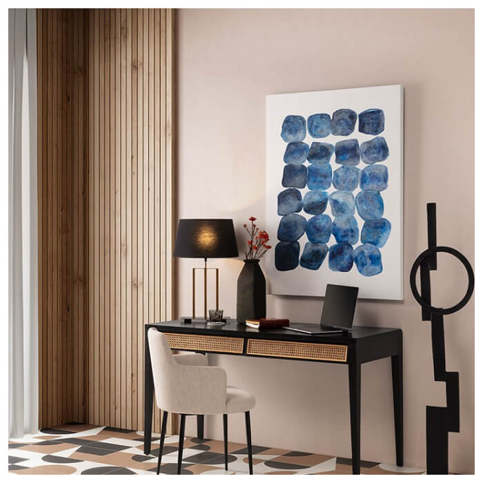 Este lienzo decorativo de colores fusiona la pureza del blanco con la calma del azul, creando un ambiente relajante y sofisticado. Ideal para lienzos decorativos para despachos, dormitorios o salones, su diseño de vanguardia transforma cualquier pared en una obra de arte.