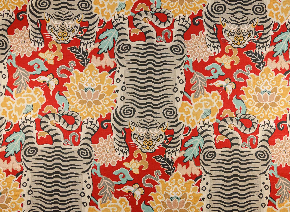 Espectacular tejido estampado, 100% algodón, con un diseño figurativo de inspiración surasiática, con una original mezcla de motives florales y tigres.